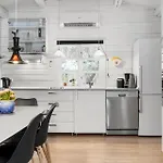An electric kettle, a refrigerator, and an oven are standard in a kitchenette.
